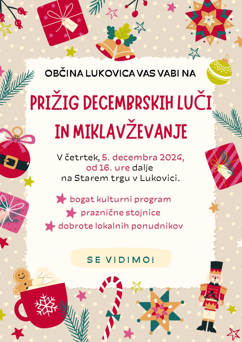 Občina Lukovica vas v četrtek, 5. decembra 2024, od 16. ure dalje vabi na PRIŽIG DECEMBRSKIH LUČI in MIKLAVŽEVANJE na Starem trgu v Lukovici. Zabavali se boste ob kulturnem programu, obisku prazničnih […]