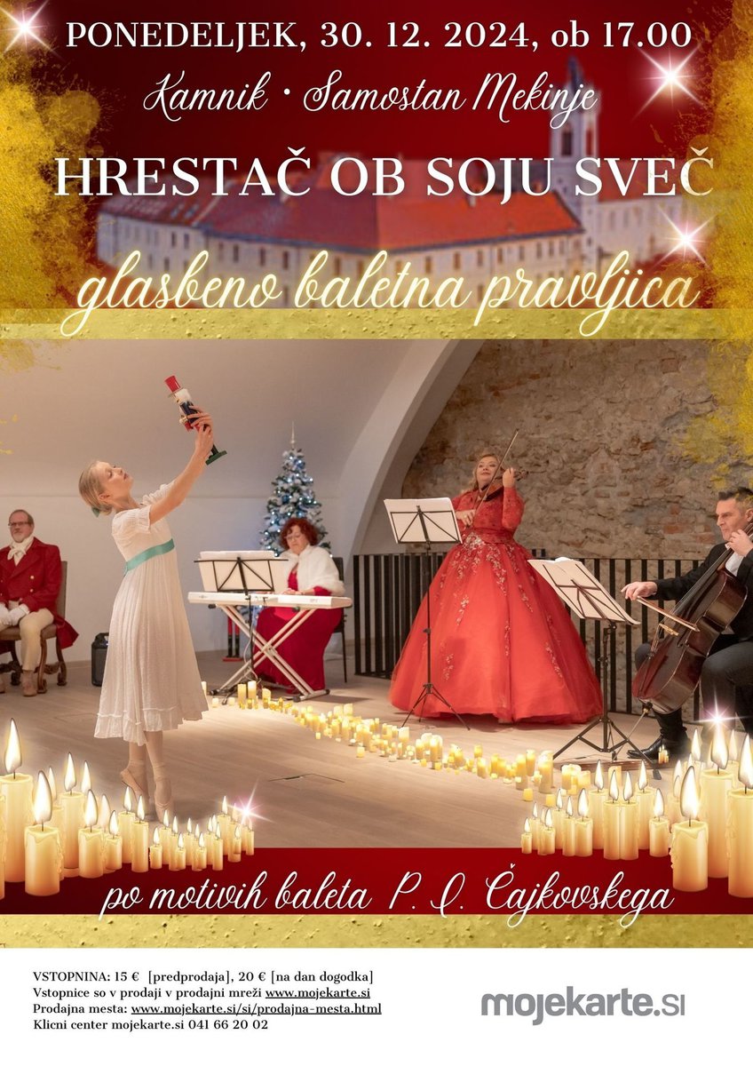 Samostan Mekinje, Polčeva pot 2, KamnikDoživite čudovito glasbeno - baletno pravljico po motivih baleta Hrestač P. I. Čajkovskega v posebni atmosferi ob soju 250 sveč. : Inga Ulokina, violina, umetniško vodstvo Olga Ulokina, klavir, aranžmaji […]