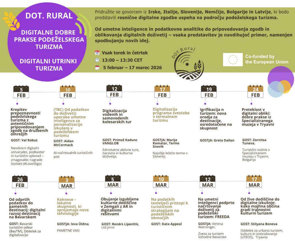 V okviru Erasmus + projekta D.O.T. Rural, vas vabimo na 12 brezplačnih, kratkih srečanj, kjer bomo predstavili digitalne dobre prakse podeželskega turizma iz Evrope.